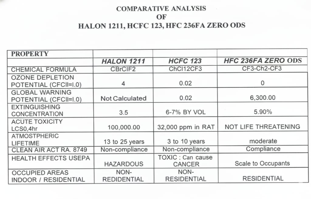 Approved replacement of ozone-damaging Halon products by the US Environmental Protection Agency (EPA) and the Philippine Environmental Management Bureau (EMB).